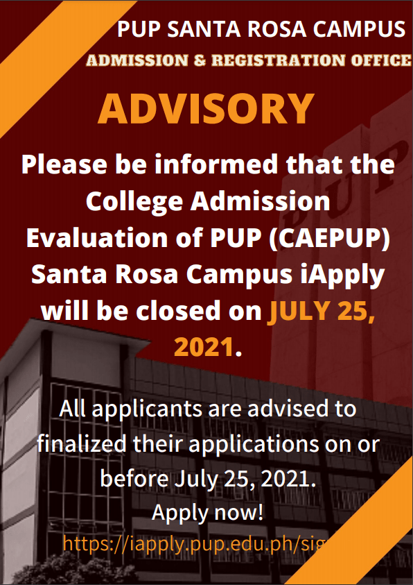 Please be informed that the College Admission Evaluation of PUP (CAEPUP) Santa Rosa Campus iApply will be closed on JULY 25, 2021.