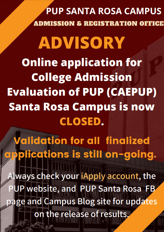 Admission CAEPUP 2021-22 ADVISORY no.3 Online application for College Admission Evaluation of PUP (CAEPUP) Santa Rosa Campus is now CLOSED. For inquiries send email to admission.starosa@pup.edu.ph Share this: Click to share on X (Opens in new window) X Click to share on Facebook (Opens in new window) Facebook Like Loading... Related