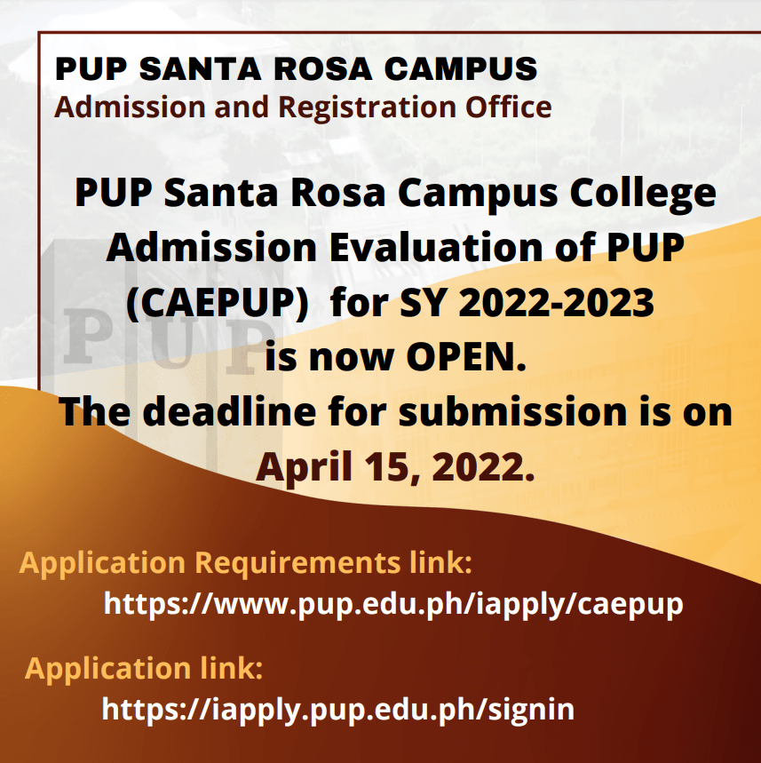 Admission CAEPUP for SY 2022-2023 is now OPEN Application Requirements link:https://www.pup.edu.ph/iapply/caepup Application link:https://iapply.pup.edu.ph/signin Share this: Click to share on X (Opens in new window) X Click to share on Facebook (Opens in new window) Facebook Like Loading... Related