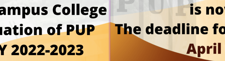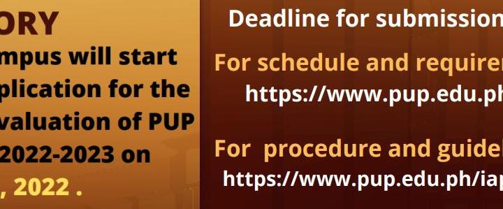 PUP Santa Rosa Campus will start accepting online application for the College Admission Evaluation of PUP (CAEPUP) for SY 2022-2023 on February 3, 2022 . Deadline for submission is on April 15, 2022. For procedure and guidelines: https://www.pup.edu.ph/iapply/procedure/caepup For schedule … Continue reading CAEPUP 2022-2023 Advisory No. 1